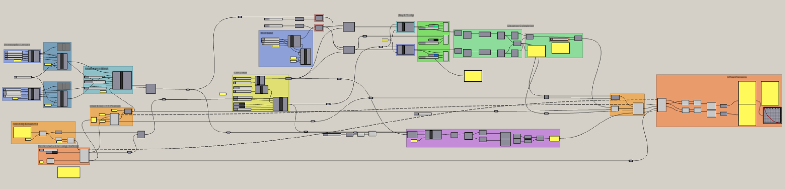In the video he uses the Galapagos plugin to do some optimisation on the lens, this works well when you have a lot of variables that can all affect the system in a way to complex to know all of the impacts. For some of my purposes, such as building an anamorphic adapter, I’m often really only changing one variable, and so that approach is a bit overkill, so I used the Anemone Plugin to make some loops instead and go through the my focusing range while changing the offset between the two lenses. Doing it this way gave me a way to find out the adjustment needed to make to an anamorphic to line up the two different focal lengths, for a given focusing distance, without resorting to using an equation. To be honest I was hoping to be able to reverse engineer and equation through this process, but I haven’t managed yet.