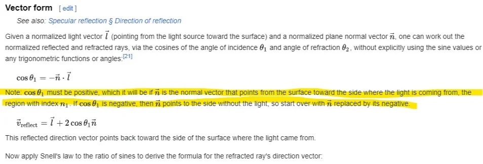 There wase one specific line of code, which is clipped in the video and so you can’t see its entirety. Annoyingly it’s also the line of code that does the actual refraction, it stumped me for a bit until I realised it was just the vector from of Snell’s Law .